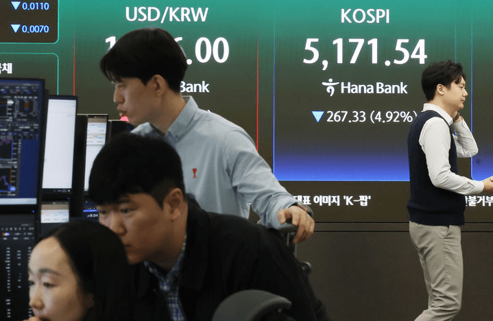 30일 한국거래소에 따르면 코스피는 전 거래일보다 257.07포인트(4.73%) 하락한 5181.80에 개장한 뒤 오전 9시 8분 기준 전 거래일 대비 4.50% 내린 5193.90을 기록하고 있다.
